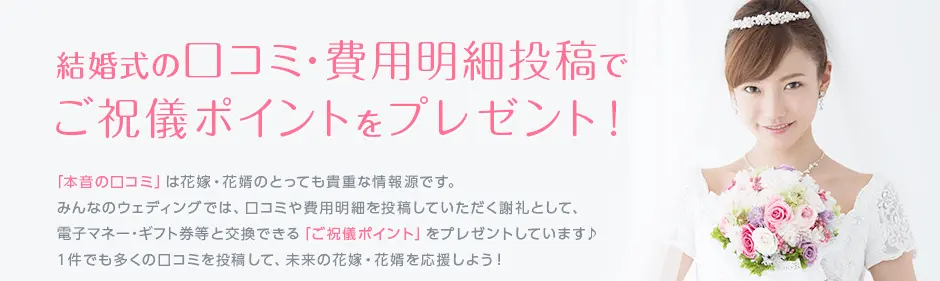 みんなのウェディングでは、結婚式の口コミ投稿でご祝儀ポイントがもらえます。