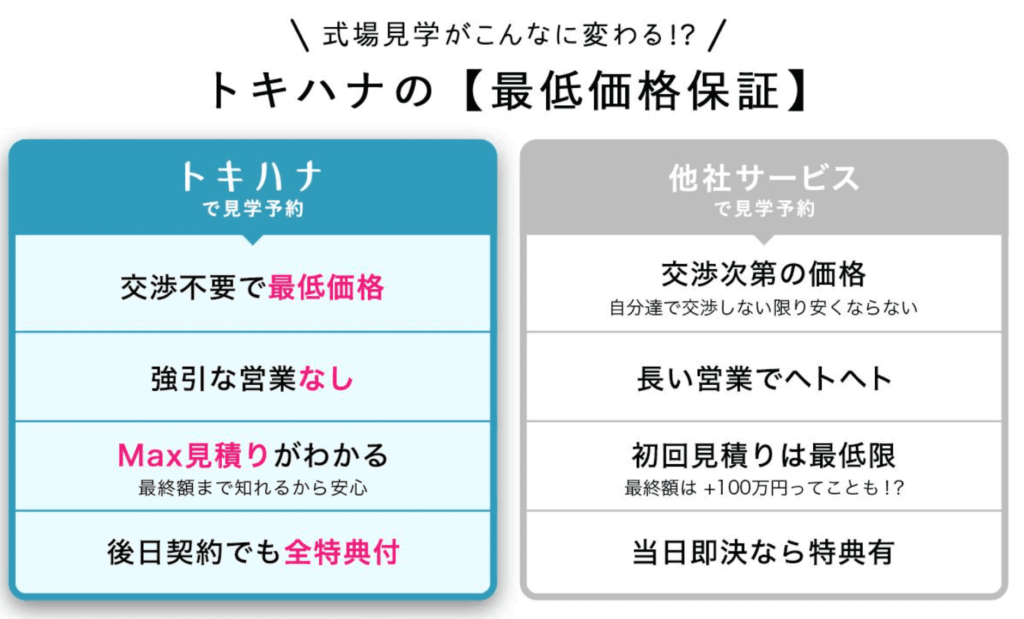 さらにトキハナは「即決不要の最低価格保証」つき。ブライダルフェアで急かされたり、値引き交渉が苦手で損をする心配もなく、どのカップルも最初から適正価格で契約できます。
